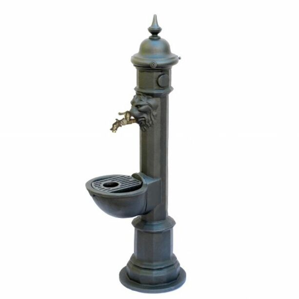 Gefertigt wird der historische Brunnen aus elektrochemisch verzinktem Gusseisen und ist dadurch wetterfest sowie langlebig. Ein besonderes Elements des Zierbrunnens ist der Löwenkopf in dessen Maul der Wasserhahn montiert wird. Der Brunnen ist gegen Aufpreis in weiteren Farben der RAL Palette erhältlicht. Gerne können Sie uns Ihren Farbwunsch über den Kundenservice mitteilen.