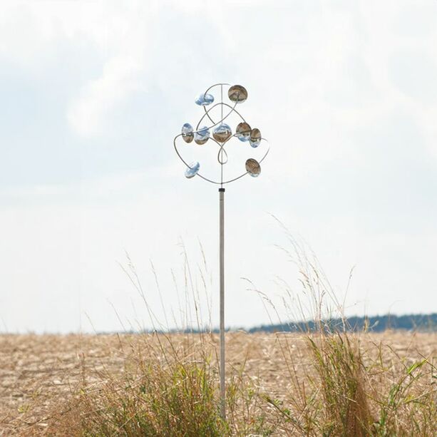 Das stilvolle Windrad dreht sich schon bei leichtem Wind. Durch den Einsatz eines doppelten Kugellagers wird das reibungslose Drehen begünstigt. Das Kugellager sollte regelmäßig geölt werden. Durch einen U-förmigen Bodenanker wird ein stabiler Stand ermöglicht.
