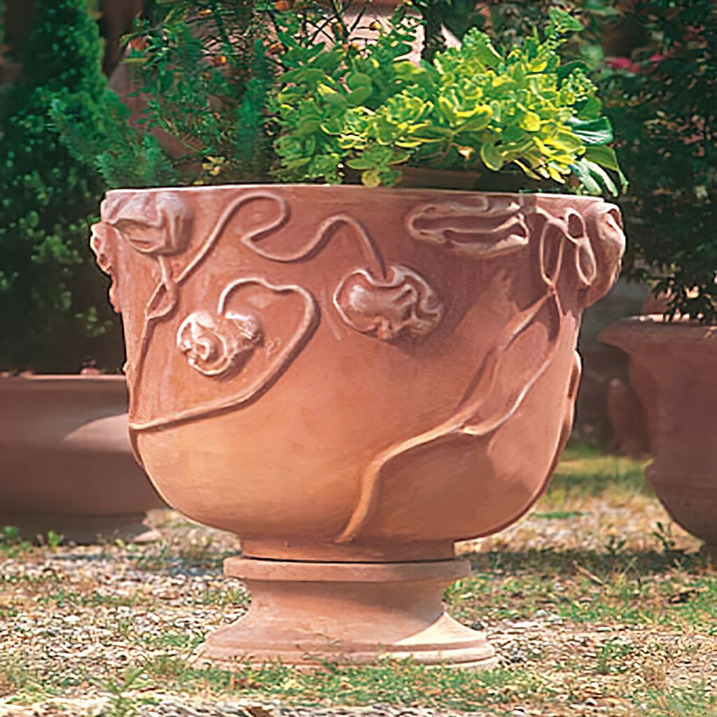 Bereits in der Antike und der Renaissance stellte Terrakotta ein beliebtes, leicht zu bearbeitendes Material dar, um Skulpturen, Vasen und Säulen stilvoll und gleichzeitig robust herzustellen. Für die Verarbeitung wird ein spezielles, eisenhaltiges Tongemisch verwendet, welches den Pflanztöpfen einen einzigartigen warmen, roten Farbton mit Nuancen verleiht. Für dieses Pflanzgefäß wird Impruneta-Terracotta verwendet, mit einem besonders hohen Anteil an Kuper-, Eisen- sowie Aluminiumoxiden. Nachdem das Steingut abgebaut und gekocht wurde, wird das Material zu einem Blumentopf geformt, welcher in liebevoller Handarbeit Verzierungen erhält. Nach der Modellierung erfolgt der Brennprozess im traditionellen Holzofen bei 960°C. Die für Terrakotta übliche Brenntemperatur liegt somit bei dieser speziellen Sorte höher. Im Gegensatz zu klassischem Ton erhält dieser Naturstoff keine Glasur am Ende der Bearbeitung. Passend zu dem Pflanzgefäß finden Sie bei uns Podeste und Skulpturen aus Terrakotta.