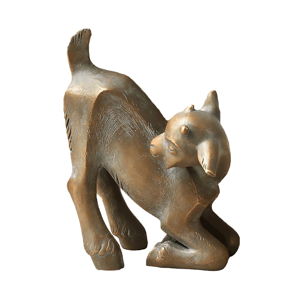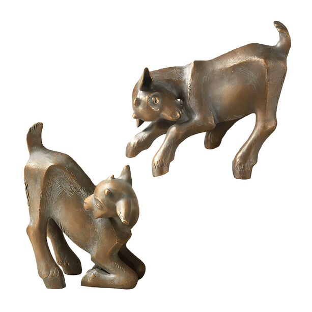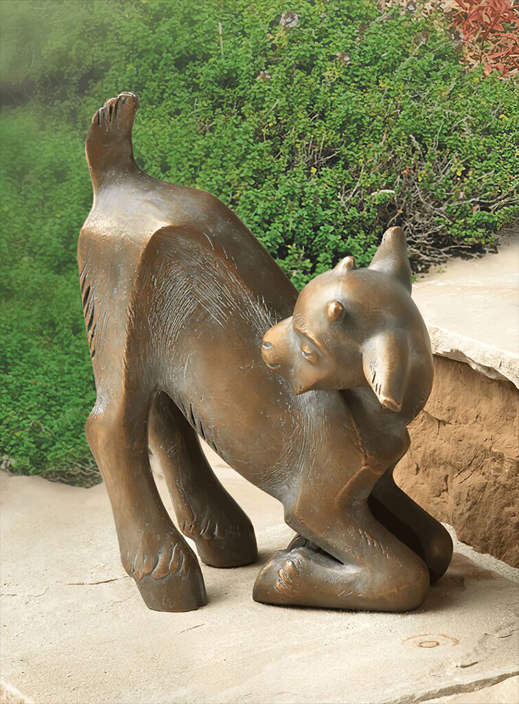 Die Bronze ist extrem robust gegenüber Frost, Nässe sowie Hitze und sehr langlebig. Die Patina wird per Hand aufgetragen und führt aufgrund variierender Farbnuancen zu einer Einzigartigkeit jeder Skulptur. Die Farbe kann somit leicht vom Bild abweichen. Die Reinigung sollte ohne chemische Substanzen erfolgen, um die Schutzschicht nicht zu zerstören und kann einfach mit einem feuchten Tuch erfolgen. Die Gartenstatuen werden für die Befestigung an einem Sockel mit Bohrungen an der Unterseite ausgestattet. Passende Gewindestifte liegen der Lieferung bei. Aufgrund des Hohlgusses sind die Skulpturen trotz der massiven Bronze recht leicht und können somit problemlos überall aufgestellt werden.