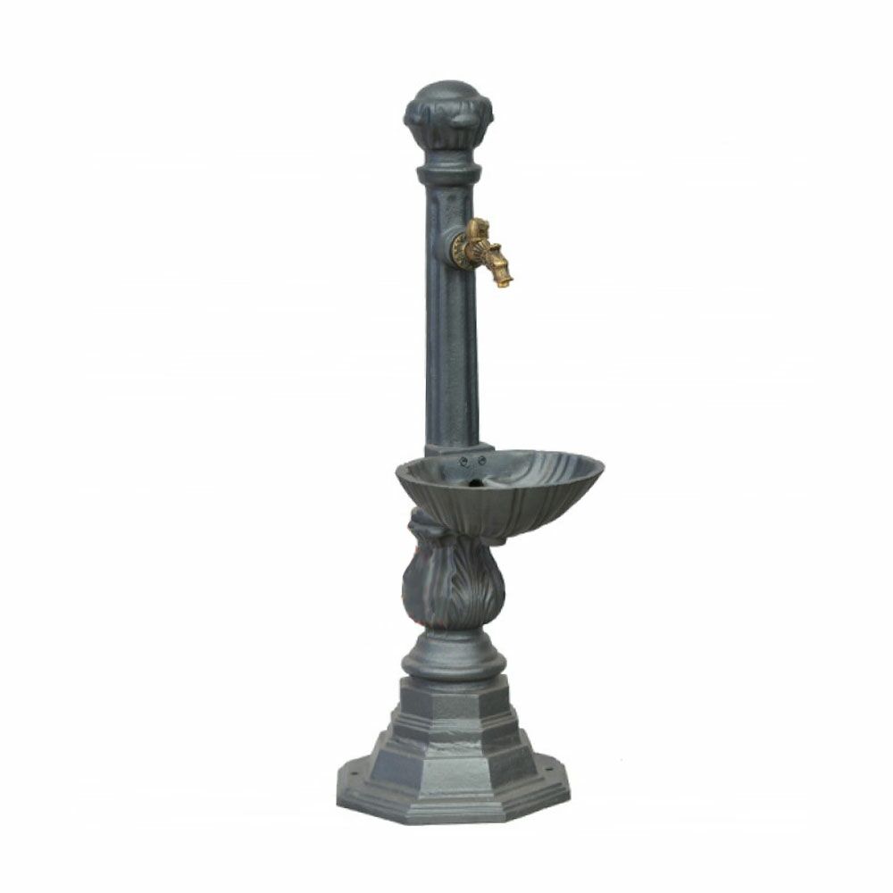 Dieser Standbrunnen besticht durch die vielen historischen Dekoelemente. Aus Gusseisen gefertigt ist er zudem äußerst wetterbeständig und langlebig. Auf Wunsch und gegen Aufpreis ist eine Fertigung in weiteren Farben der RAL Palette möglich. Wenden Sie sich hierzu gerne an unseren Kundenservice.