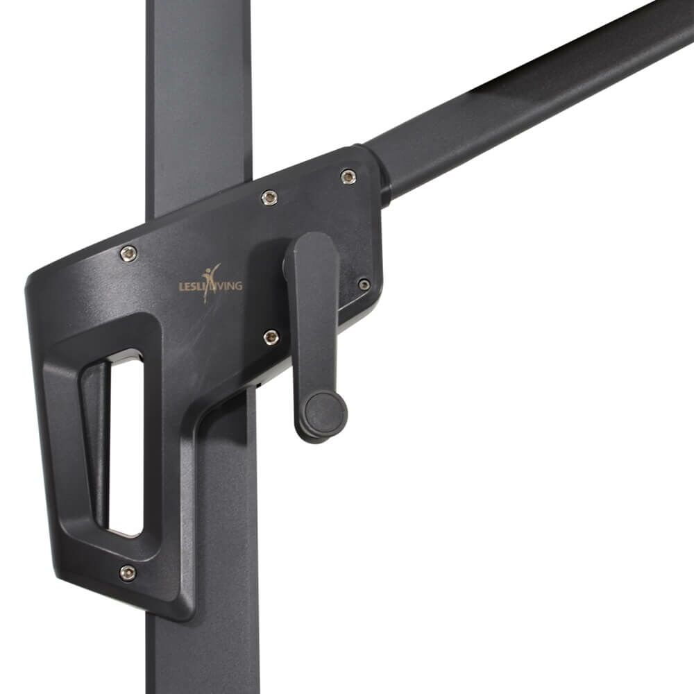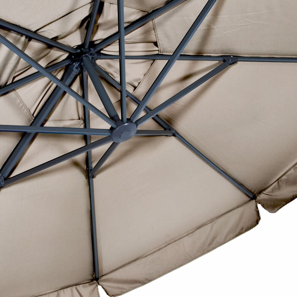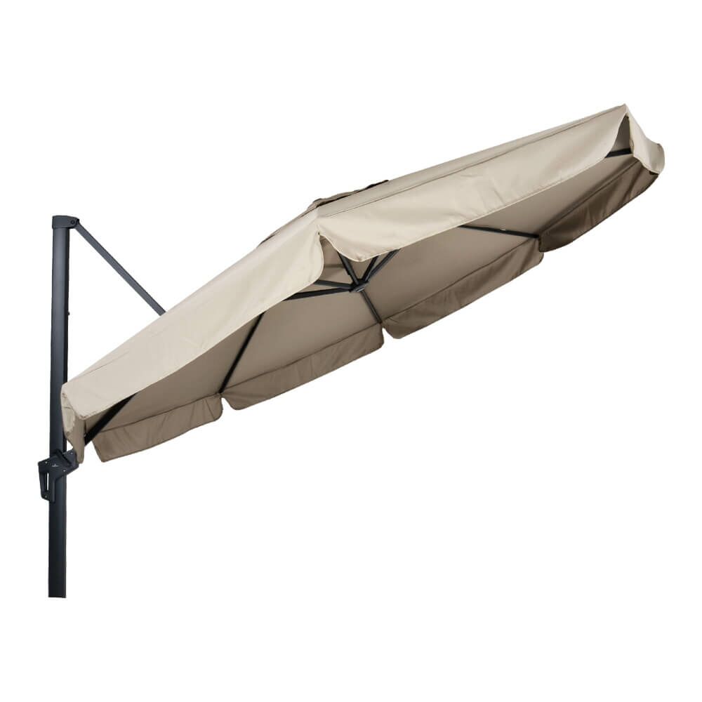 Dieser schöne Sonnenschirm ist mit einem Aluminiumgestell gefertigt. Das Gestell erhält eine matte Beschichtung in Anthrazit. Die acht Rippen spannen den Schirm auf. Das 250 gr/m^2 Polyester ist strapazierfähig und schützt vor UV-Strahlung bis 30+. Mittels Kurbel sowie Federsystem kann der Sonnenschirm einfach geöffnet und geschlossen werden. Der Schirm ist um 360 Grad drehbar. Eine passende Schutzhülle aus Polyethylen ist im Lieferumfang entahlten. Zur Reinigung empfehlen wir Wasser und einen Schwamm. Von säurehaltigen Reinigungsmitteln wird abgeraten. Diese beeinträchtigen das Gewebe und somit die Strapazierfähigkeit. Zum Schutz sollte der Schirm mit einer Abdeckhaube vor Witterung geschütz werden.