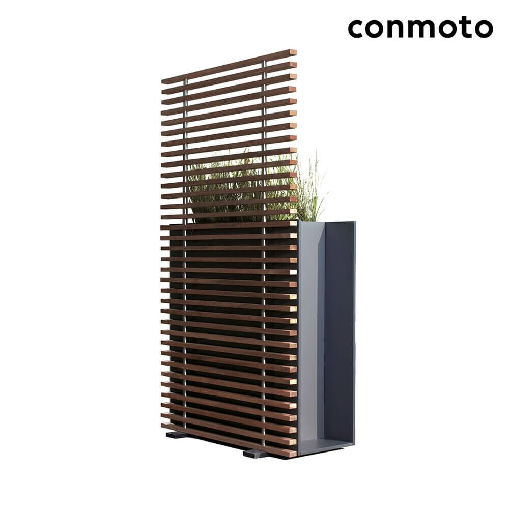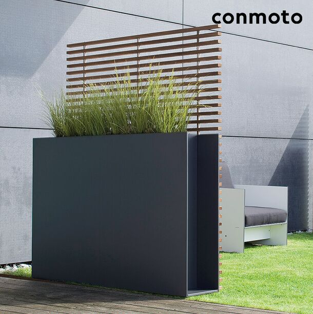 Die Pflanzgefäße sind die ideale Ergänzung zu den Gartenmöbeln unserer Kollektion Conmoto und können frei mit diesen kombiniert werden. Das edle Design und die hohe Robustheit unterstreichen die vielfältige Einsatzbarkeit des Blumenkübels. Dieser kann sowohl als Sichtschutz für eine Sitzecke, als Dekoobjekt im Garten sowie auch als Blumenrabatte auf der Terrasse genutzt werden. Die Herstellung in verschiedenen Größen ist möglich. Individuelle Farbvarianten lassen Ihren Garten zu einem einzigartigen Ruhepunkt werden. Gern erstellen wir Ihnen ein unverbindliches Angebot zu Ihren Sonderwünschen. Das Dekorationselement ist auch ohne Rankengitter erhältlich, welches neben der Verwendung von Thermoesche auch aus Teakholz gefertigt werden kann. Das Holzgitter dient als schöner Raumteiler sowie Sichtschutz und steht auf Edelstahlfüßen. Es wird mittels zwei Schrauben am oberen Rand der Blumentöpfe standsicher befestigt.