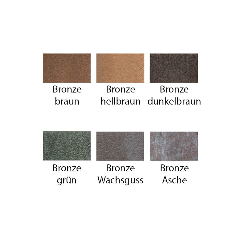Die Bronze ist extrem robust gegenüber Frost, Nässe sowie Hitze und sehr langlebig. Die Patina wird per Hand aufgetragen und führt aufgrund variierender Farbnuancen zu einer Einzigartigkeit jedes Vogelbades. Die Farbe kann somit leicht vom Bild abweichen. Die Reinigung sollte ohne chemische Substanzen erfolgen, um die Schutzschicht nicht zu zerstören und kann einfach mit einem feuchten Tuch erfolgen. Die Gartenstatuen werden für die Befestigung an einem Sockel mit Bohrungen an der Unterseite ausgestattet. Passende Gewindestifte liegen der Lieferung bei. Die Fertigung mit einer Cortenstahlpatina ist möglich. Im Gegensatz zu richtigem Cortenstahl liegt der Vorteil im Nicht-Verlaufen der Rostpatina bei Nässe.