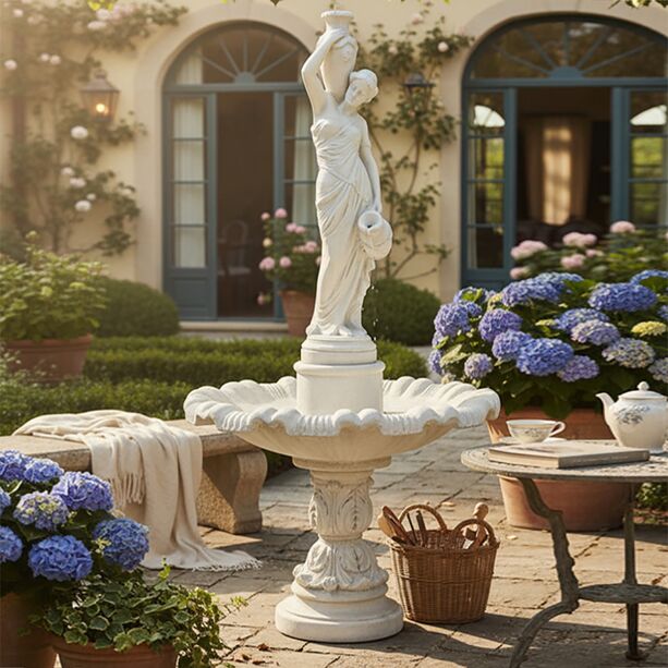 Der Gartenbrunnen wird aus hochwertigem Kunststein angefertigt und enthält unter anderem Bestandteile von Quarz, Kalkstein und Feldspäten. Der Brunnen wird von Hand bemalt, wodurch einzigartige Farbverläufe entstehen. Jedes Wasserspiel ist ein Unikat, welches durch hochqualitative Materialien und eine professionelle Verarbeitung eine ausgezeichnete Witterungsbeständigkeit erreicht. Der Steinguss trotzt sowohl heißen wie auch kalten Temperaturen und besitzt die Fähigkeit der Selbstreparatur. Das bedeutet, dass Mikrorisse sich in einer natürlichen Umgebung von selbst heilen bzw. wieder verschließen. Die Dekoration wird mit einem halbglänzenden Finish in Ihrer Wunschfarbe geliefert.