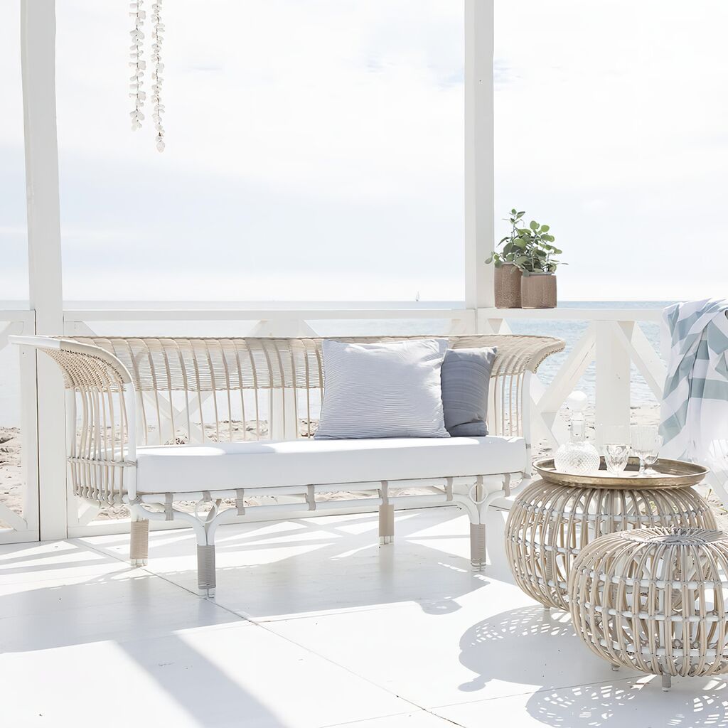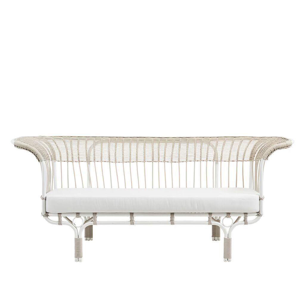 Strahlend weißes Gartensofa für Momente der nordischen Gemütlichkeit. In Handarbeit werden die Art Fibre Fasern um das Aluminiumgestell geflochten. Das Outdoor Sofa ist wetterfest und resistent gegenüber UV-Strahlung. Das Sitzmöbel kann das ganze Jahr über im Freien stehen. Mit einem farbigen Kissen können Sie es ganz nach Ihrem Geschmack gestalten. Das Design des majestätisch wirkenden Sofas stammt aus dem Jahr 1951.