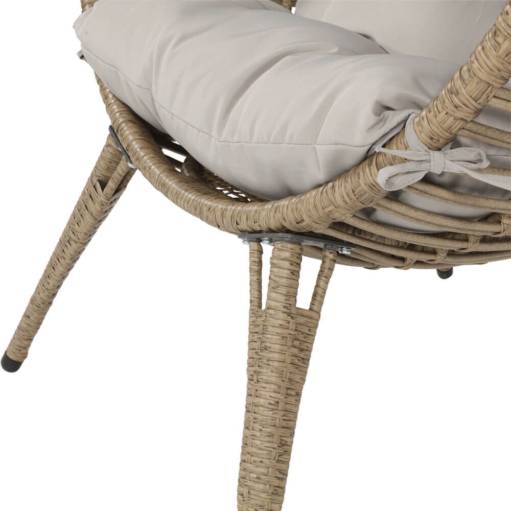 Dieser robuste Gartenstuhl wird unter ständiger Qualitätskontrolle aus Kunststoff und Stahl gefertigt. Das Gestell erhält eine Politur und ist farblich pulverbeschichtet. Die Sitzfläche wird aus einem Mix von 8x1 mm flachen sowie 8mm runden Korbgeflecht designt und mit einer 300D Polyester-Auflage (125x75x10cm (HxBxT)) mit Baumwollfüllung geliefert.Das Outdoor-Möbelstück ist beständig gegenüber Witterung und kann ganzjährig im Außenbereich eingesetzt werden. Zur Reinigung sind Wasser und ein Schwamm ausreichend. Von säurehaltigen Reinigungsmittel wird abgeraten. Diese können die Oberfläche schädigen und zu einem Verlust der Wetterbeständigkeit führen.