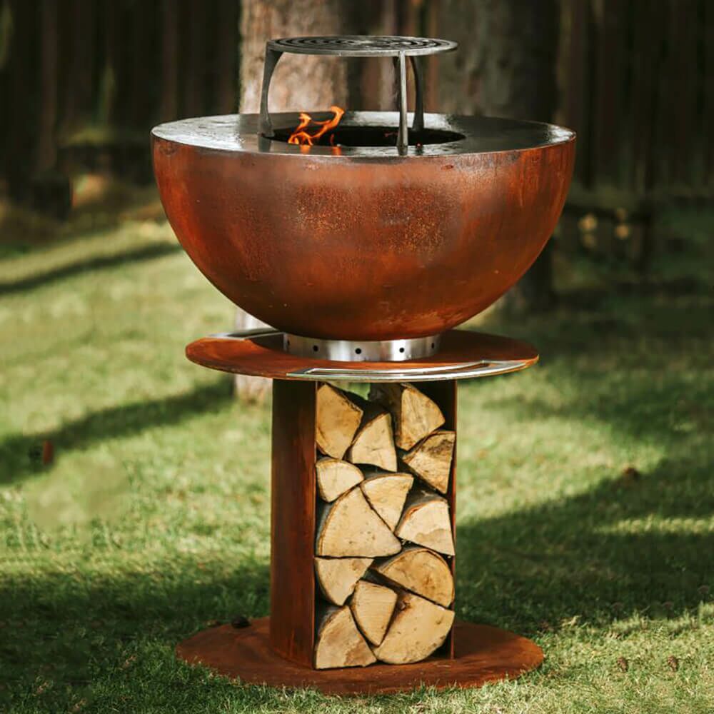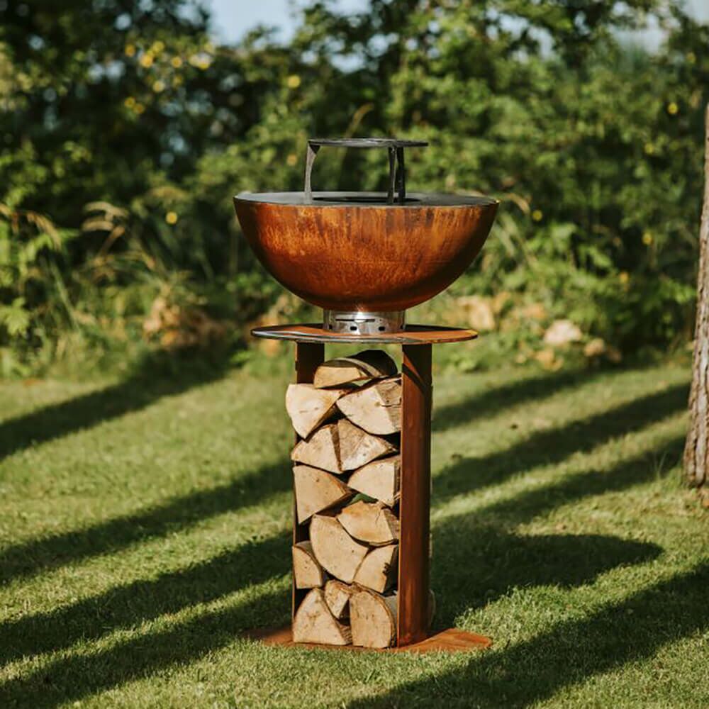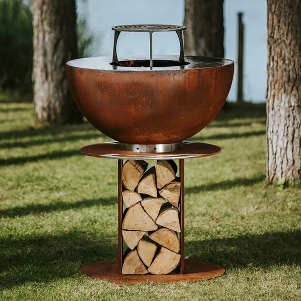 Die rostfarbene Optik des runden Gartengrills wird durch die Verwendung von Cortenstahl hervorgerufen. Die Feuerschale dient zum Einen als Grillfläche und kann zum Anderen auch als Wärmespender eingesetzt werden. Ein Grillrost in der passenden Größe kann optional dazu gewählt werden. Der Sockel ist so konstruiert, dass immer Feuerholz zum Nachlegen darin gestapelt werden kann.