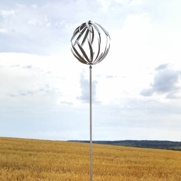 Das stilvolle Windrad dreht sich schon bei leichtem Wind. Durch den Einsatz eines doppelten Kugellagers wird das reibungslose Drehen begünstigt. Das Kugellager sollte regelmäßig geölt werden. Durch einen U-förmigen Bodenanker wird ein stabiler Stand ermöglicht.
