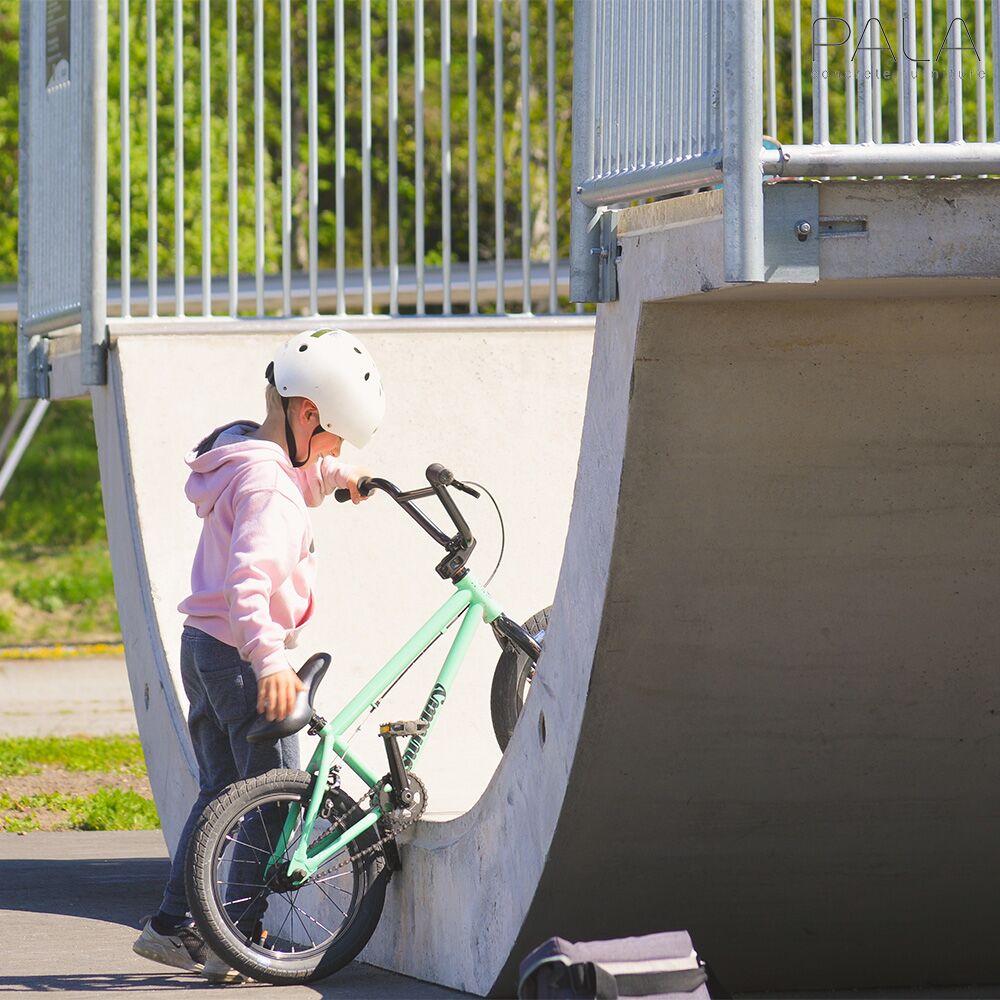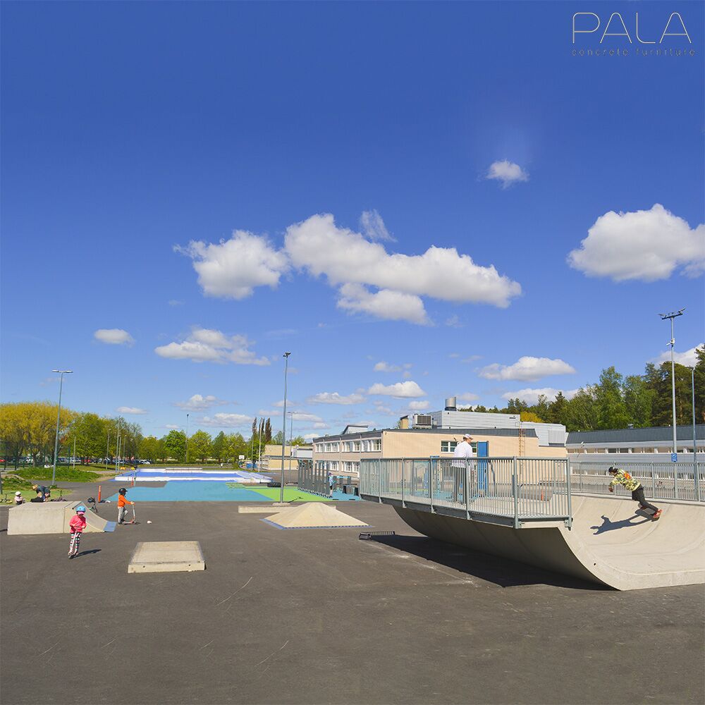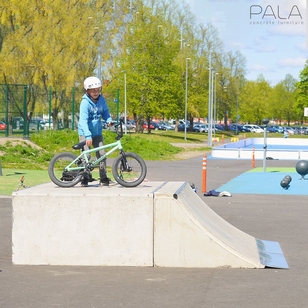 Diese robusten und wetterbeständigen Skatepark Elemente werden in Finnland von Pala gefertigt. Im Gussverfahren entstehen aus Beton moderne Outdoor Spots für Städte und Parks, die zu sportlichen Treffpunkten für junge Leute werden. Für die Montage der Elemente sollte der Untergrund möglichst glatt, idealerweise asphaltiert sein. Einzelne Skate-Elemente stehen frei. Werden jedoch verschiedene Module miteinander kombiniert, sollten die Nähte vergossen und die Metallteile miteinander verschweißt werden. Gerne bringen wir auch Ihre individuellen Wünsche in Form. Senden Sie uns hierfür eine Skizze und die benötigten Maßangaben für Ihre einzigartigen Ideen aus Beton und wir erstellen Ihnen ein unverbindliches Angebot. Für das Abladen bei Anlieferung werden ein Gabelstapler und ein Kran benötigt.