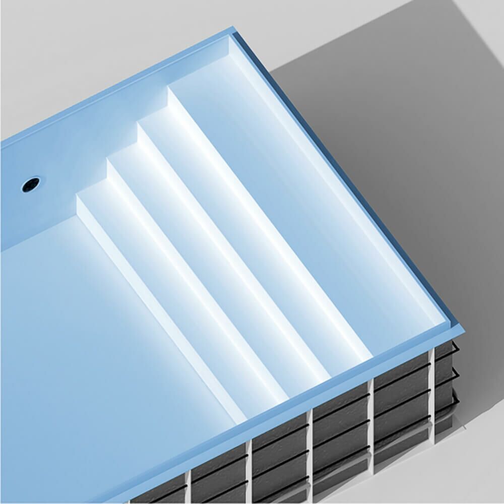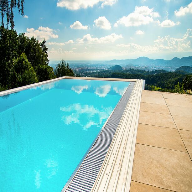 - runde Ecktreppe oder Treppe entlang der gesamten Poolbreite jeweils mit Anti-Rutsch-Stufen