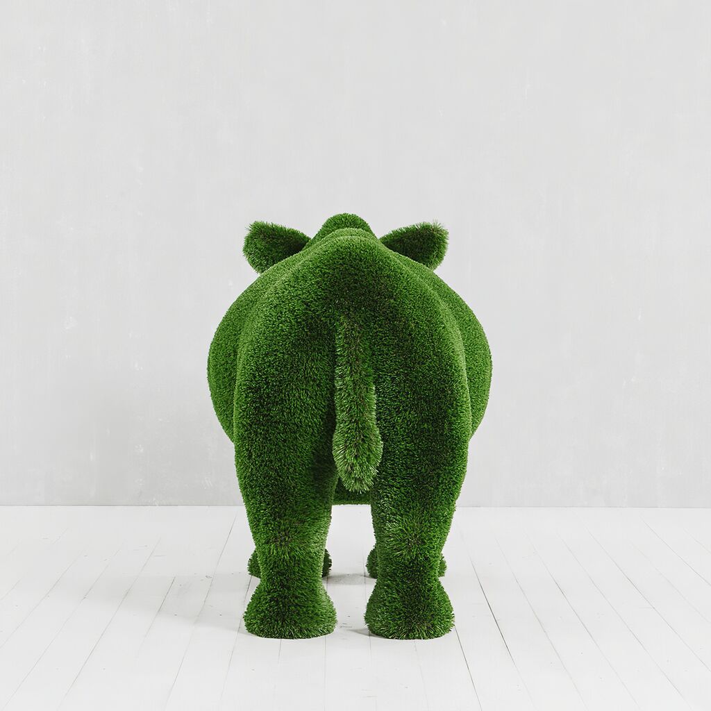 Alle Figuren entstehen als 3D-Modell am Computer. Anschließend wird der Rahmen aus Glasfaserkunststoff hergestellt und von Hand mit Kunstrasen beklebt. Jede Skulptur ist somit ein individuelles Unikat. Dank des Glasfaser Rahmens sind die Topiaries besonders leicht, stoßfest und langlebig - außerdem rostfrei, korrosions- sowie temperatur- und UV-beständig. Es sind keine weiteren Pflegemaßnahmen nötig. Die Gewichtsbeschränkung für die Formschnittfiguren liegt zwischen 30 bis 250kg. Wichtig ist, dass die Skulpturen weit entfernt von Feuerstellen aufgestellt werden.