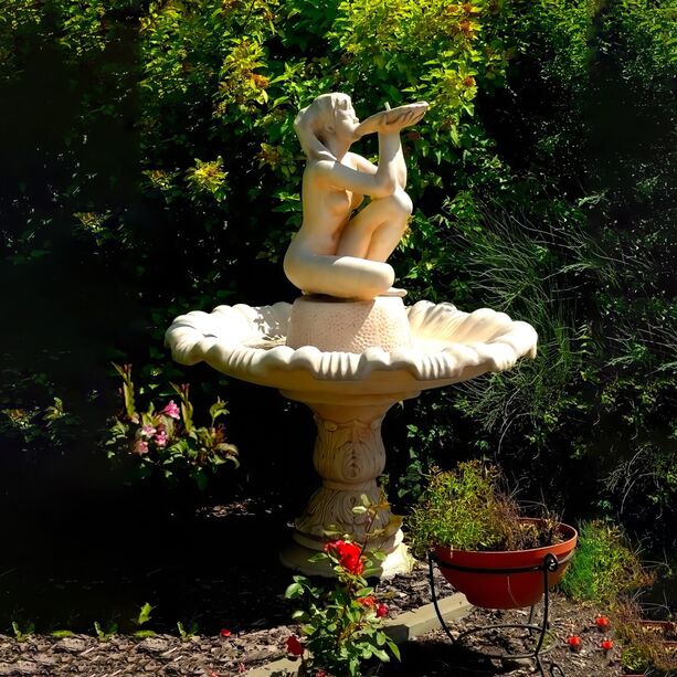 Der Gartenbrunnen wird aus hochwertigem Kunststein angefertigt und enthält unter anderem Bestandteile von Quarz, Kalkstein und Feldspäten. Der Brunnen wird von Hand bemalt, wodurch einzigartige Farbverläufe entstehen. Jedes Wasserspiel ist ein Unikat, welches durch hochqualitative Materialien und eine professionelle Verarbeitung eine ausgezeichnete Witterungsbeständigkeit erreicht. Der Steinguss trotzt sowohl heißen wie auch kalten Temperaturen und besitzt die Fähigkeit der Selbstreparatur. Das bedeutet, dass Mikrorisse sich in einer natürlichen Umgebung von selbst heilen bzw. wieder verschließen. Die Dekoration wird mit einem halbglänzenden Finish in Ihrer Wunschfarbe geliefert.