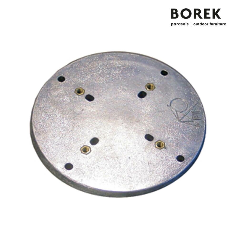 Die verzinkte Terrassenplatte ist zur Befestigung eines Sonnenschirms auf der Terrasse geeignet. Das verwendete Metall ist wetterfest und korrosionsbeständig. Sie können die Terrassenplatte des niederländischen Unternehmens Borek in wenigen Handgriffen am Terrassenboden befestigen und so ein sicheres Fundament für Ihren Sonnneschirm errichten. Dazu passende Sonnenschirme und Sonnenschirmständer finden Sie ebenfalls in unserem Shop.
