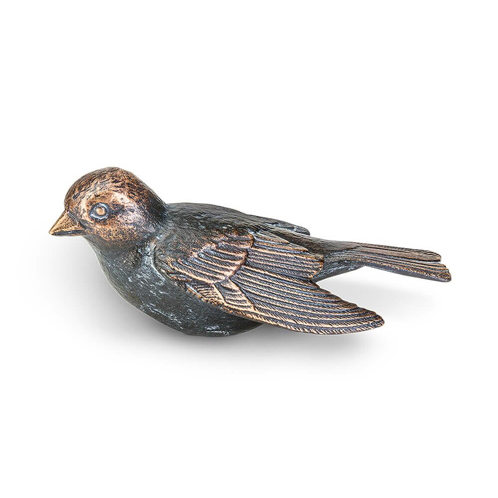 Der kleine Bronzevogel eignet sich hervorragend zur stilvollen Gestaltung von Blumenrabatten, Vogeltränken und Vogelhäusern. Das robuste Metall kann neben der gezeigten Ausführung mit Sonderpatina in weiteren Farbvarianten gefertigt werden.
