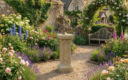 Romantischer englischer Cottage Garten mit Kiesweg und einer sommerlichen Rahmenbepflanzung mit Stauden.