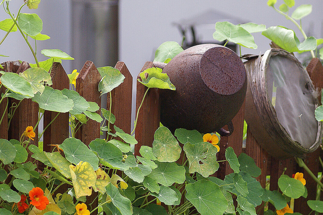 Wie bereits erwähnt, üben bestimmte Elemente des Bauerngartenstils einen Einfluss auf die Gestaltung eines Landhausgartens aus. Dennoch sollten Sie aufpassen, dass Sie die beiden Stile deswegen nicht miteinander verwechseln. Anders als beim Landhaustil, steht beim Bauerngarten nach wie vor der pragmatische Nutzen, also die Selbstversorgung mit eigens angebauten Nahrungsmitteln, wie Obst, Gemüse und Kräutern im Vordergrund. Zwar ist diese nicht mehr existenziell wie ursprünglich bis in die zweite Hälfte des 19. Jahrhunderts, als Bauerngärten noch von ihren Namensgebern zur reinen Bewirtschaftung und Grundnahrungsversorgung angelegt wurden, jedoch steht heute noch immer ein gewisses Naschvergnügen im Fokus. Hinzugekommen sind die dekorative Note der Gärten sowie die durch die Anlegung eines solchen Gartens versuchte Rückbesinnung auf naturnahes und tierfreundliches Gärtnern. Grundsätzlich gilt jedenfalls, dass neben dem größeren Schwerpunkt auf Versorgung, das Rustikale des Bauerngartens den größten Unterschied zum Landhausgarten ausmacht. Zwar finden sich gemütliche Holzbänke oder Obstleitern in beiden Gärten gleichermaßen, jedoch werden sie im Landhausgarten vielfach gepaart mit zierlichen gusseisernen Accessoires oder antiken Schmuckstücken, wie alten Sonnenuhren oder kupfernen Metallbadewannen mit Bepflanzung. Im bescheideneren Bauerngarten dagegen sind Vogelscheuchen oder auch ein Paar dekorative Gummistiefel denkbar.