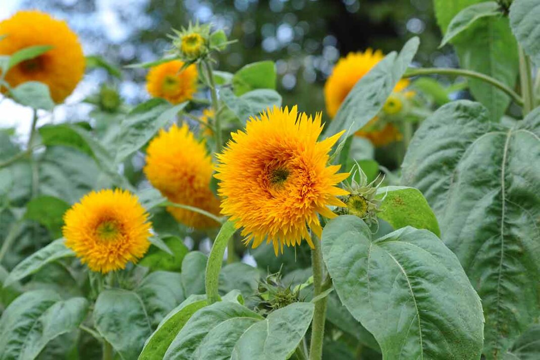 Es gibt viele verschiedene Helianthus-Arten, darunter zahlreiche von Menschenhand gezüchtete. Neben den Riesen finden sich einige Zwerge in der Gattung der Sonnenblumen. Es gibt solche, die aufrecht und beinahe wie ein kleiner Baum wachsen, und jene, die mehr wie ein Busch in die Breite gehen und dazu mehrere Stängel ausbilden. Manche Allergiker reagieren in der Nähe blühender Sonnenblumen mit Allergiesymptomen. Wer darauf verzichten möchte, greift stattdessen zu Sonnenblumen-Arten, die gefüllte Blüten entwickeln. Sie bringen keinen Pollen hervor und verblühen einfach, ohne dass sich anschließend noch Kerne entwickeln. In der großen Helianthus-Familie gibt es demnach reichlich Vielfalt zu entdecken. Je nach Art können die Pflanzen weitere Aufgaben übernehmen. Die Großgewachsenen eignen sich zum Beispiel als zügig wachsender Sichtschutz. Die Vielblühenden bieten sich als Quelle für schöne Schnittblumen an. Darüber hinaus sind manche Arten die reinste Snackbar für Insekten und Vögel. In den nächsten Absätzen lernen Sie einige der wichtigsten Sonnenblumen genauer kennen.
