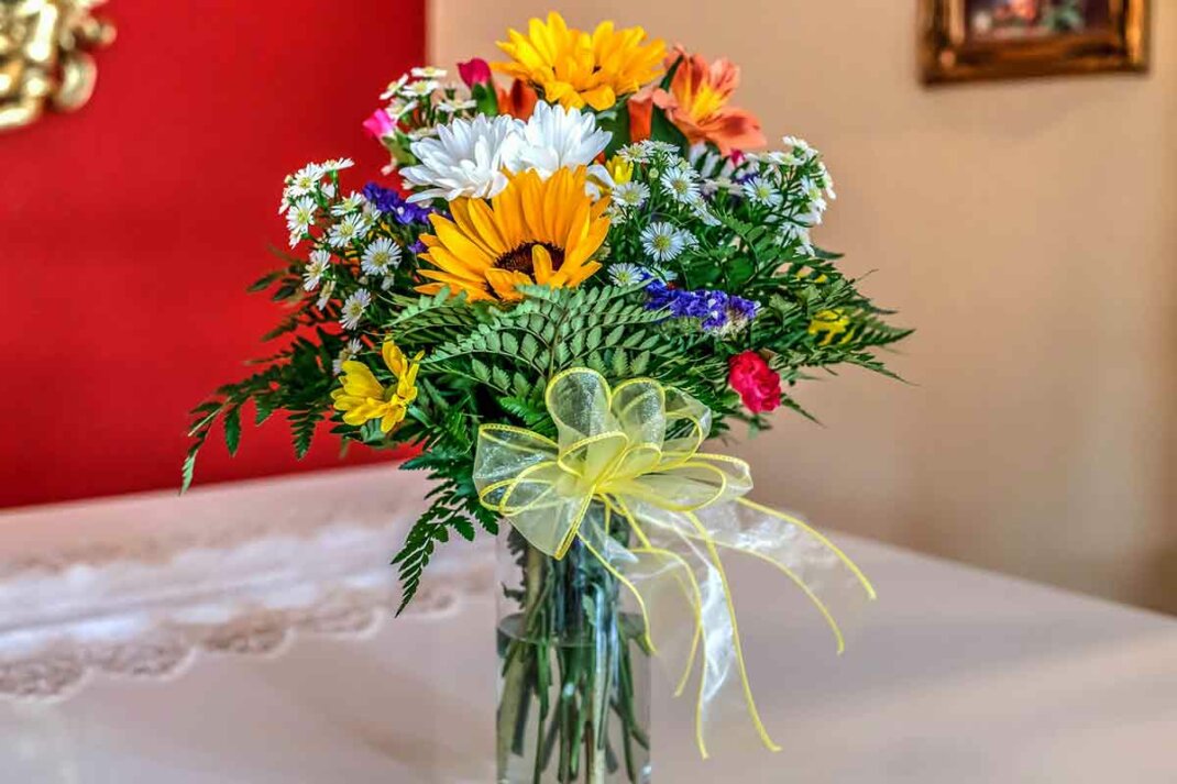 Reizvolle Blumen aller Art werden seit jeher gepflückt und als Schnittblumen für die Vase oder als Strauß verwendet. Auch bei der Sonnenblume ist das nicht anders. Es gibt eine bemerkenswerte Vielfalt in der Gattung von Helianthus, sodass sich zahlreiche Stile und Dekore realisieren lassen. Ihre Schönheit ist so verführerisch, dass die Blüten sogar den ein oder anderen Brautstrauß zieren. Dazu werden sie zum Beispiel zu mehreren als reiner Unistrauß zusammengestellt. Die Kombination mit weißen oder roten Rosen und einigen anderen Blumen erweist sich ebenfalls als stilvolle Idee. Mit Dekobändern und anderen Extras runden erfahrene Floristen das Gebinde ab. Für einen Sonnenblumen-Strauß eignen sich die kleinen bis großen Blüten sehr gut, etwa von der Sorte ‚Henry Wilde‘. Die Riesenblüten von Helianthus annuus belassen Sie hingegen besser an ihren verwurzelten Stängeln, damit sie Samen ausbilden. Natürlich soll ein Strauß möglichst lange halten. Es gibt einen bewährten Trick, um die ohnehin schon lange Lebensdauer der geschnittenen Sonnenblumen zu erhöhen. Bevor sie in die Vase kommen, sollten Sie die Enden der Stiele etwa eine Minute lang in kochendes Wasser halten. Dadurch versiegeln Sie die Schnittflächen und die Frische bleibt der Blüte erhalten.