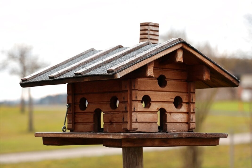 Ein Vogelhaus aus Holz sieht natürlich aus und dient als Wärmedämmung.